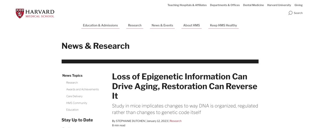 Uno studio internazionale che dura da 13 anni dimostra per la prima volta che il degrado nel modo in cui il DNA è organizzato e regolato - noto come epigenetica - può determinare l'invecchiamento di un organismo, indipendentemente dalle modifiche al codice genetico stesso. Il lavoro dimostra che un'alterazione delle informazioni epigenetiche causa l'invecchiamento dei topi e che il ripristino dell'integrità dell'epigenoma inverte i segni dell'invecchiamento.